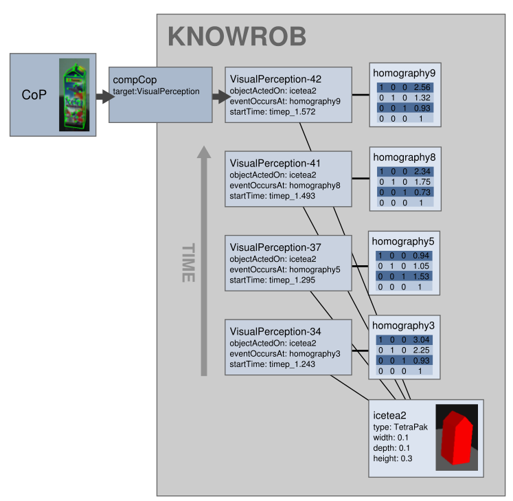 Object recognition algorithms, for instance, are described as sub-classes in the VisualPerception tree. Multiple events can be assigned to one object, describing different detections over time or differences between the current world state and the state to be achieved. The resulting internal representation is visualized below. Based on information from the vision system, KnowRob generates VisualPerception instances that link the object instance icetea2 to the different locations where it is detected over time.
