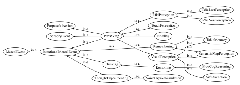 In KnowRob, these elements are linked by the event that created the respective belief: the perception of an object, an inference process, or the prediction of future states based on projection or simulation. The relation is thus reified, that is, transformed into a first-class object. These reified perceptions or inference results are described as instances of subclasses of MentalEvent, for instance VisualPerception or Reasoning.